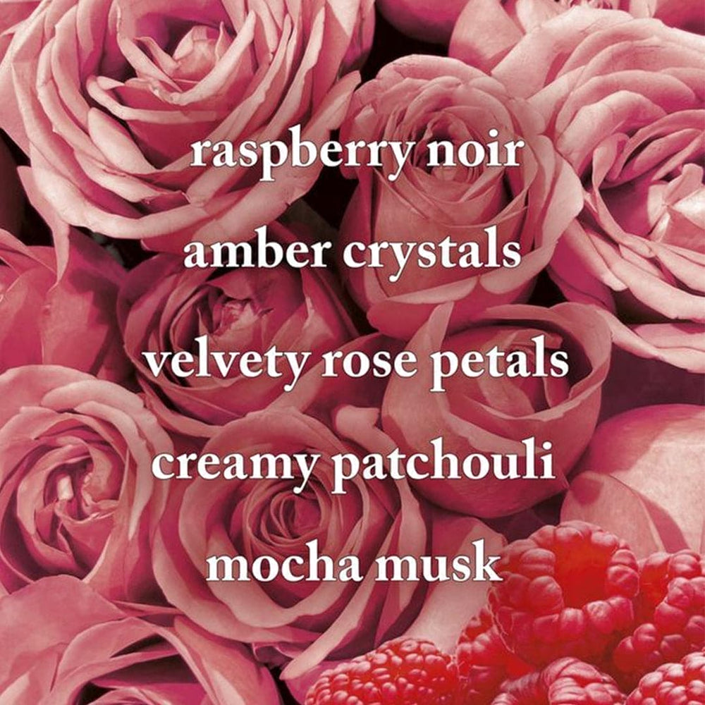 Fragrance notes: raspberry noir, amber crystals, velvety rose petals, creamy patchouli and mocha musk.