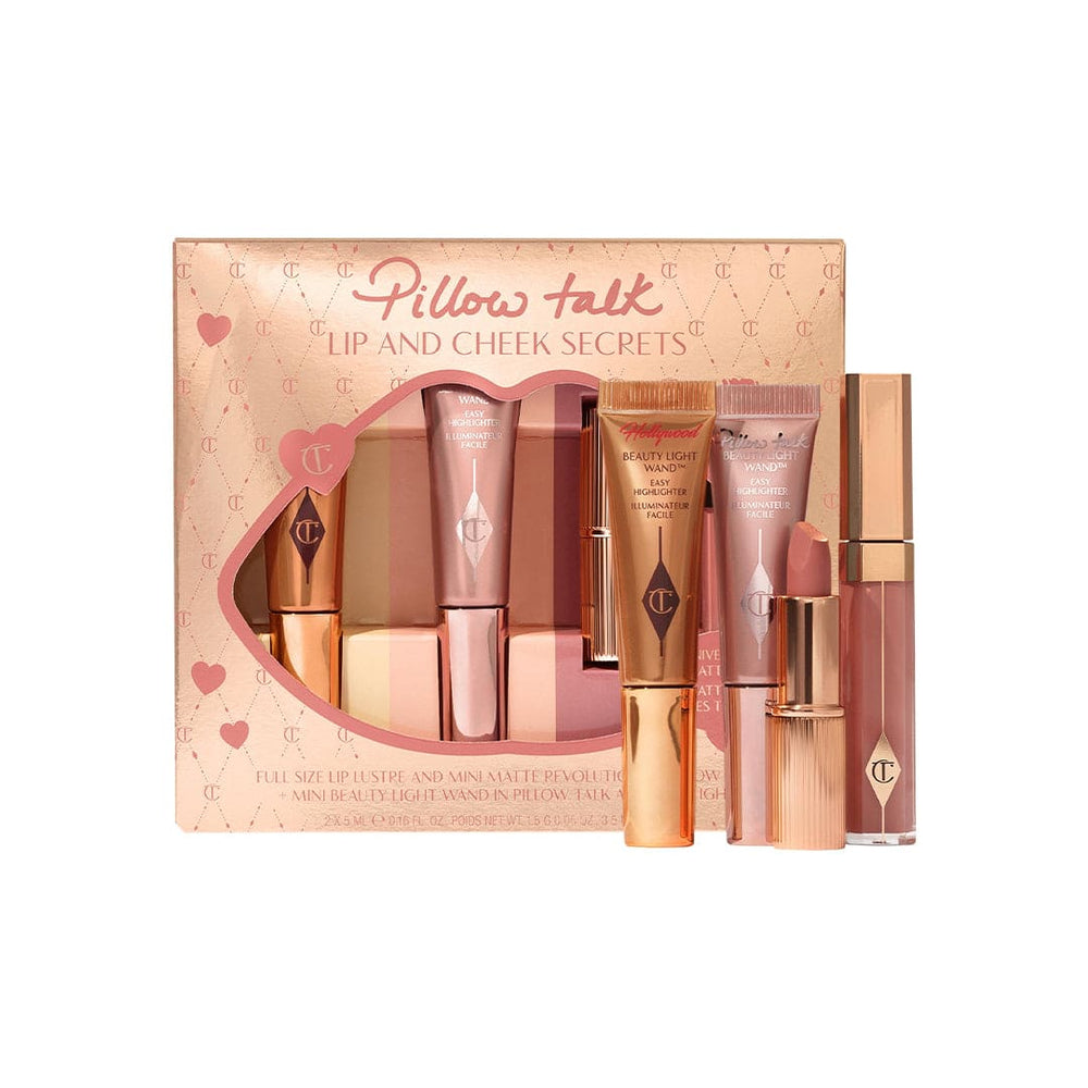 Charlotte Tilbury Pillow Talk Lip and Cheek Secrets Set is a makeup set that includes two Beauty Light Wands in Pillow Talk and Spotlight, one Pillow Talk Matte Revolution Lipstick and one Pillow Talk Lip Lustre.