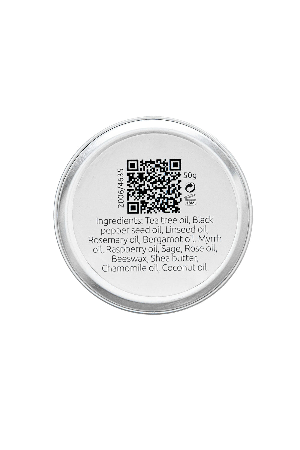 Ingredients: Tea tree oil, Black pepper seed oil, Linseed oil, Rosemary oil, Bergamot oil, Grapeseed oil, Myrrh oil, Raspberry oil, Sage, Geranium oil, Lemon oil, Rose oil, Beeswax and Shea butter.
