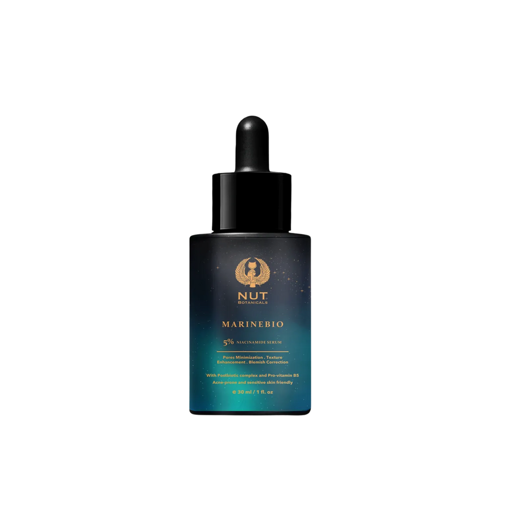 MarineBio Serum by NUT Botanicals is a must-have in any skincare routine, containing 5% niacinamide, marine postbiotics, and panthenol. This powerful combination effectively enhances skin texture, reduces hyper-pigmentation, and minimizes pores and blemish appearance.