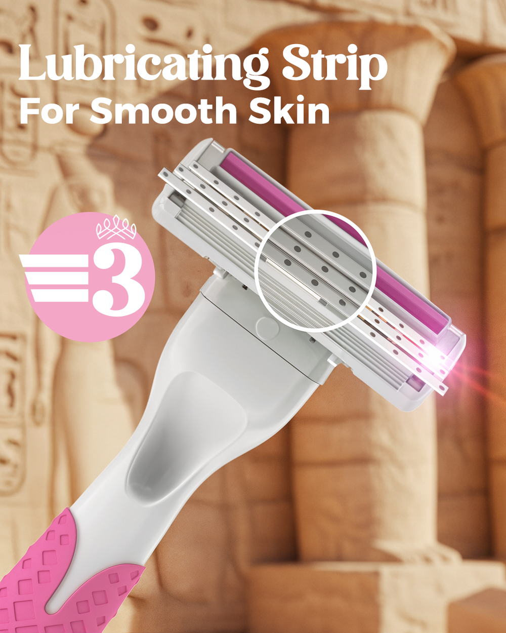 The Queen Bastet 3-Blade Women’s Razor features a feminine, ergonomic handle made from rubber and plastic for a secure grip, designed for smooth and gentle daily shaving. It includes one handle and two triple-blade cartridges, offering comfort and efficiency in hair removal.
