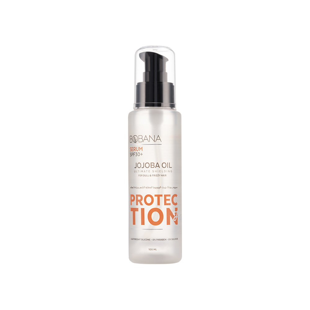 An extra-protective serum formula by Bobana enriched with Jojoba oil that repairs split ends and works as a hair shield against harmful styling heat and UV damage, providing hair protection of SPF 30+. Bobana's Jojoba Oil Serum is a strong formula for dull and frizzy hair and it repairs split ends, repels humidity and covers hair strands providing your hair with ultimate shielding, leaving your hair healthy, shiny and protected. This serum contains lightweight silicone, 0% paraben and sulphate.