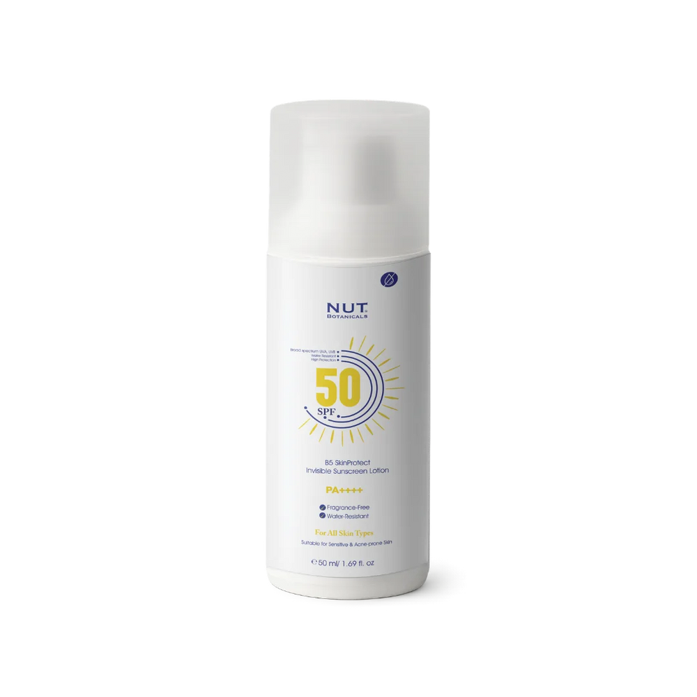 B5 SkinProtect Invisible Sunscreen Lotion by Nut Botanicals offers superior broad-spectrum protection with SPF 50 and PA++++, shielding your skin from harmful UVA and UVB rays. Its hypoallergenic, non-comedogenic formula is specifically designed for sensitive and compromised skin, including rosacea.